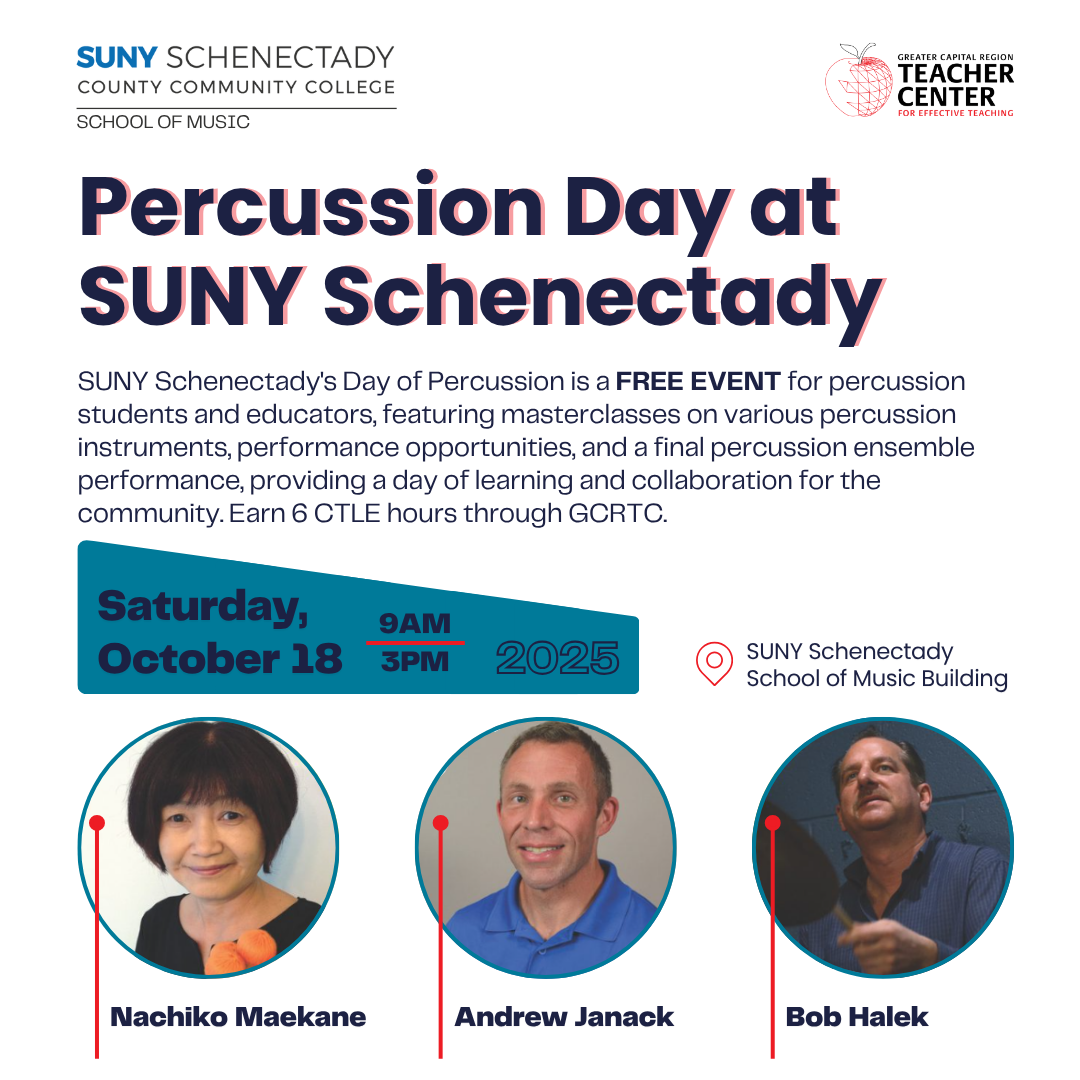 Percussion Day at SUNY Schenectady will offer music educators and their percussion students the opportunity to attend masterclasses with noted percussionists including Nachiko Maekane, Andrew Janack, Bob Halek and SUNY Schenectady School of Music faculty. Registration for Percussion Day is free and will include three concurrent masterclasses for teachers, drum set students and percussion students, followed by sessions on college audition preparations, practice tips, percussion ensemble experiences, and a performance.